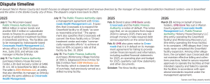 In its complaint, UMB is asking the court for damages in unspecified amounts and to appoint a receiver with authority over both treatment facilities and their revenue, bank accounts, financial records and, to the extent necessary, Crossroads and the operating companies that run the facilities.
