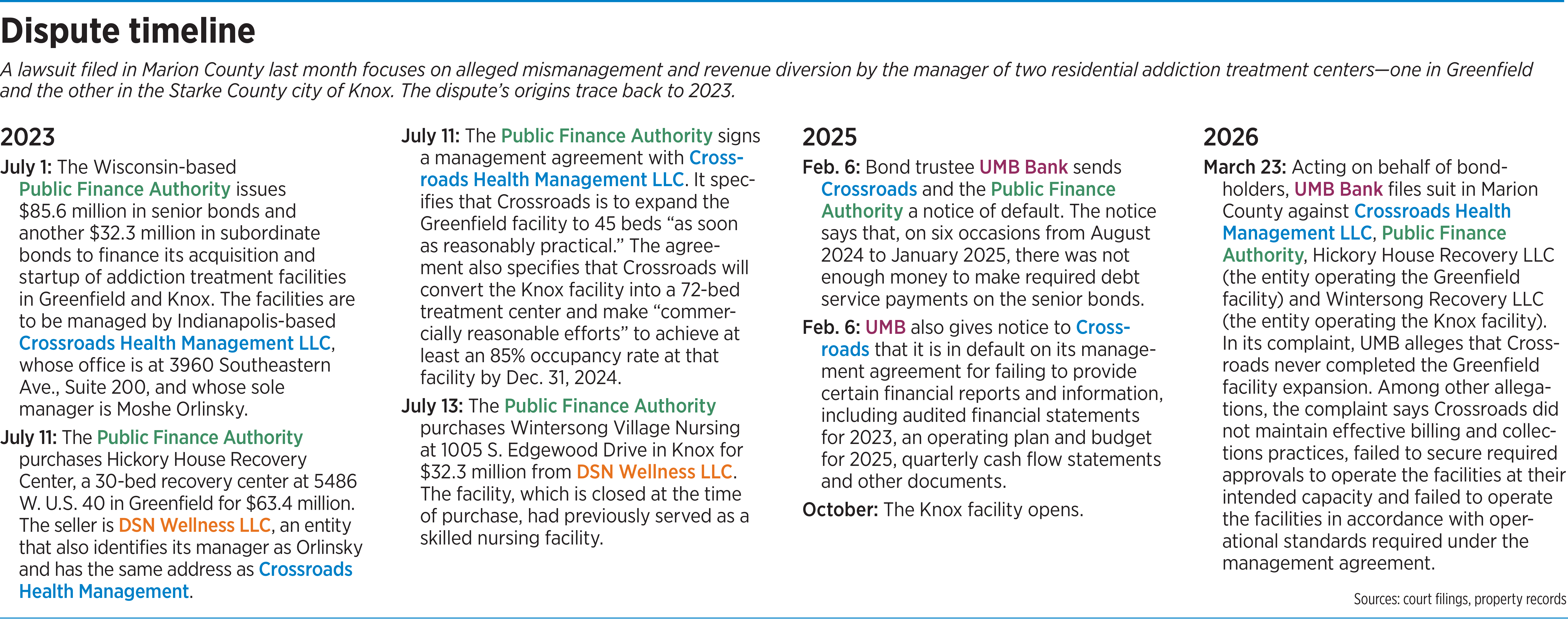 UMB filed the lawsuit March 23 in Marion County. In addition to Crossroads and the Public Finance Authority, or PFA, the two other named defendants are Hickory House Recovery LLC and Wintersong Recovery LLC, which does business as Hickory Treatment Center at Knox. Those defendants are the entities that handle day-to-day operations at the Greenfield and Knox facilities, respectively.